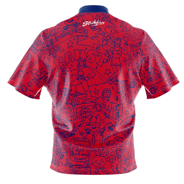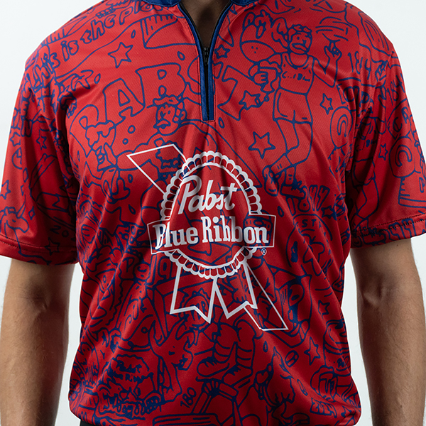 This high-tech Pabst Blue Ribbon jersey is durable and made from moisture-wicking fabric. It has a sash collar with a 3/4 zip front. The colorful design is dye-sublimated. The jersey is washable in cold water. For best results, not use bleach or fabric softener, air dry. Do not use abrasives to clean the shirt, as they may snag the fabric. The jersey is proudly made in the USA. See chart below for sizing information.