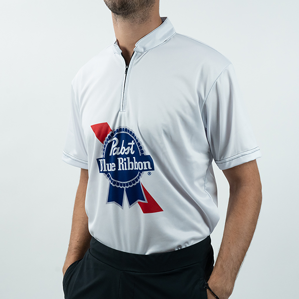 This high-tech Pabst Blue Ribbon jersey is durable and made from moisture-wicking fabric. It has a sash collar with a 3/4 zip front. The colorful design is dye-sublimated. The jersey is washable in cold water. For best results, not use bleach or fabric softener, air dry. Do not use abrasives to clean the shirt, as they may snag the fabric. The jersey is proudly made in the USA.