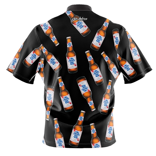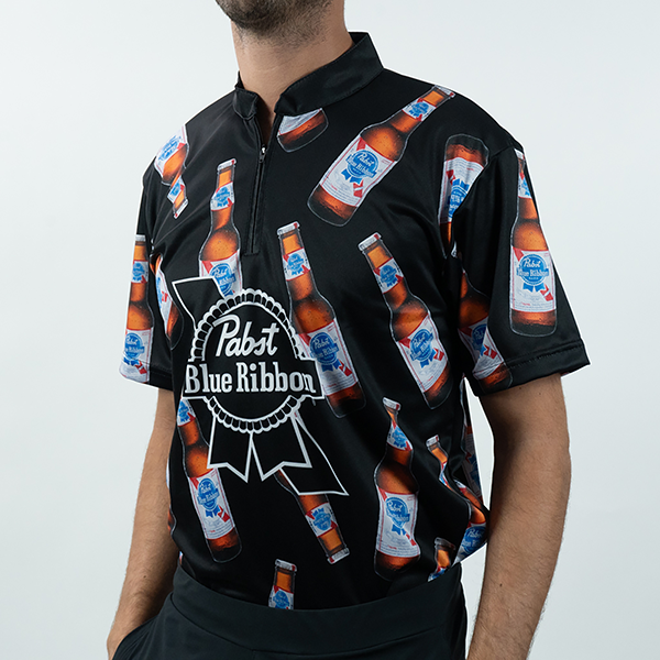 This high-tech Pabst Blue Ribbon jersey is durable and made from moisture-wicking fabric. It has a sash collar with a 3/4 zip front. The colorful design is dye-sublimated. The jersey is washable in cold water. For best results, not use bleach or fabric softener, air dry. Do not use abrasives to clean the shirt, as they may snag the fabric. The jersey is proudly made in the USA.
