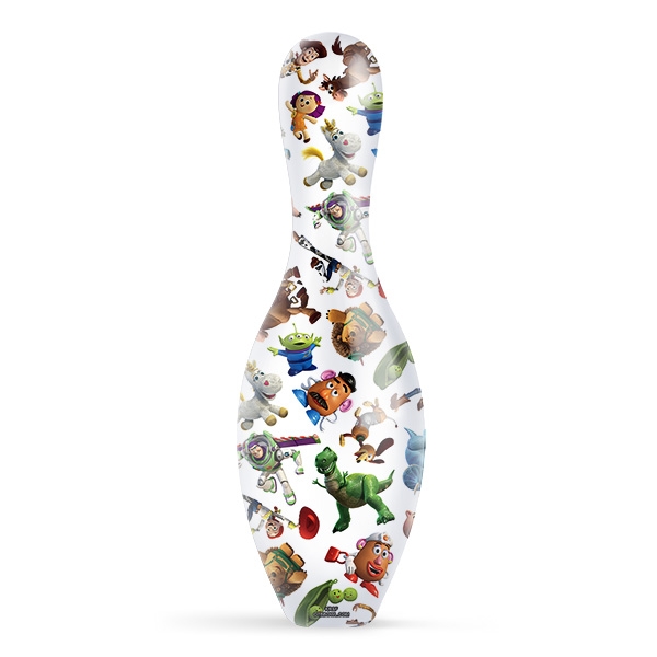 This Disney regulation size bowling pin featurrs the characters from the movie Toy Story .